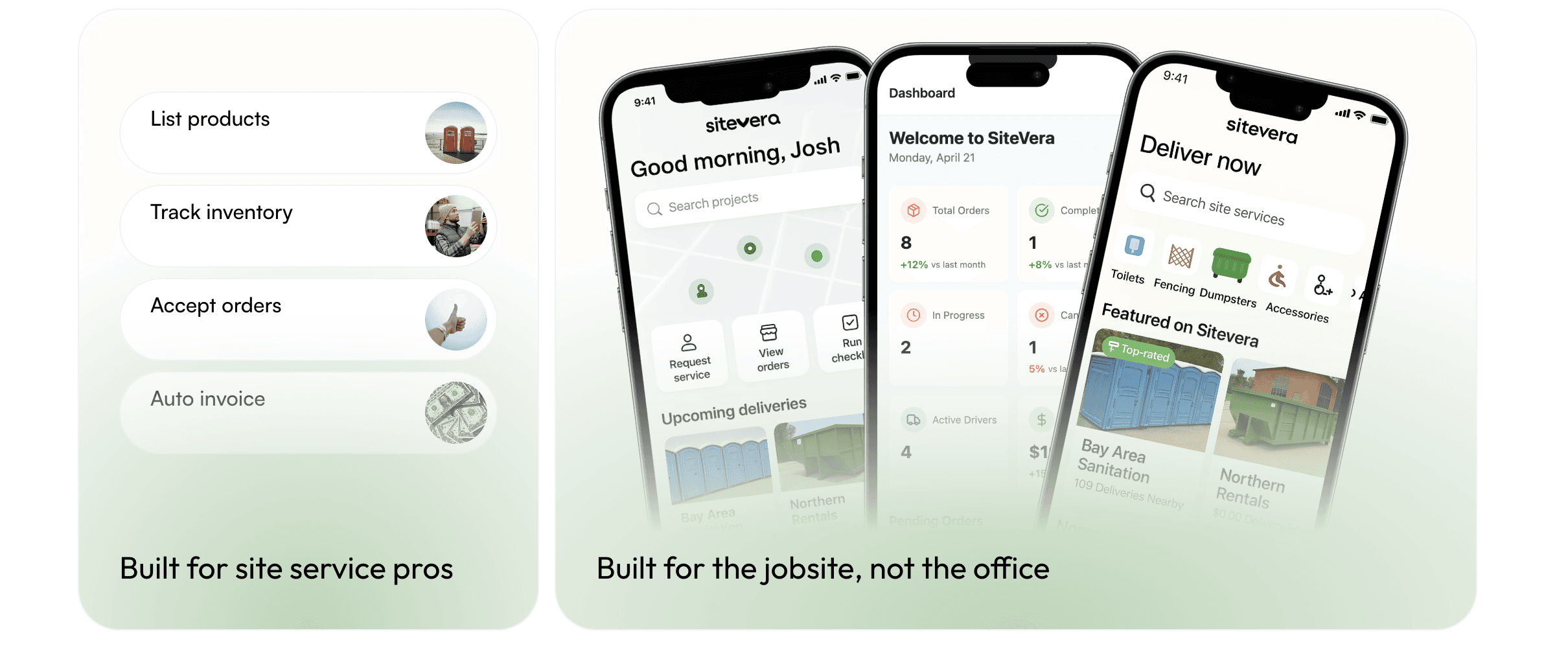 SiteVera is a logistics automation platform redefining how jobsite services are ordered, managed, and delivered. Focused on industries often overlooked by innovation, SiteVera gives vendors and contractors the ability to rent portable toilets, dumpsters, fencing, and more through one intelligent system — streamlining what used to take days into a few simple clicks.